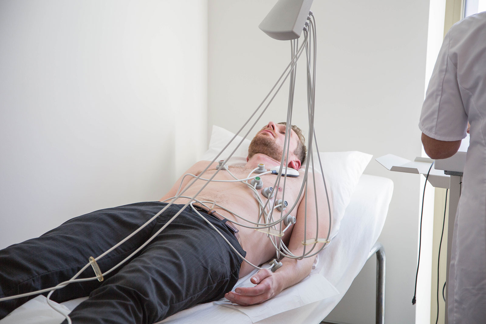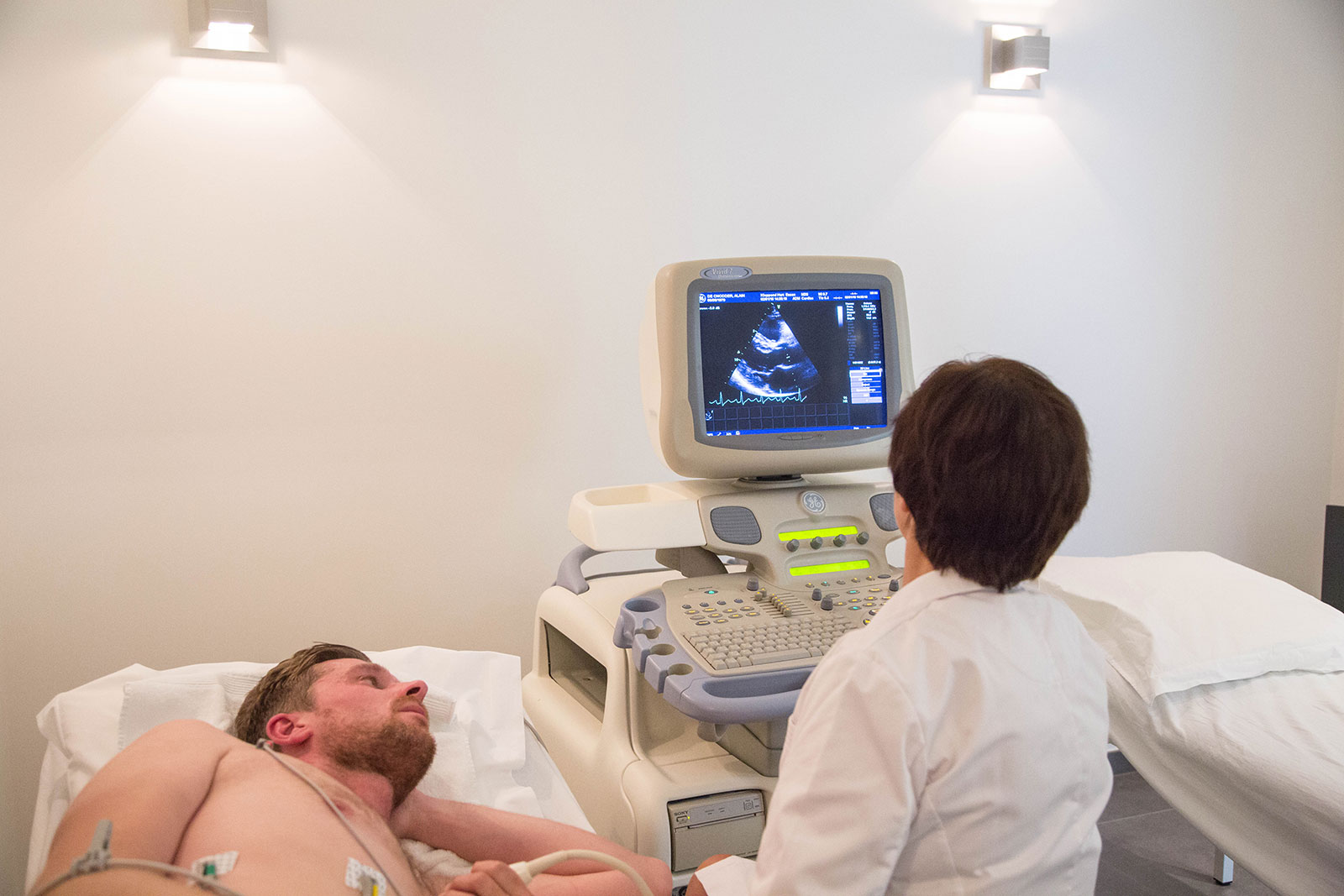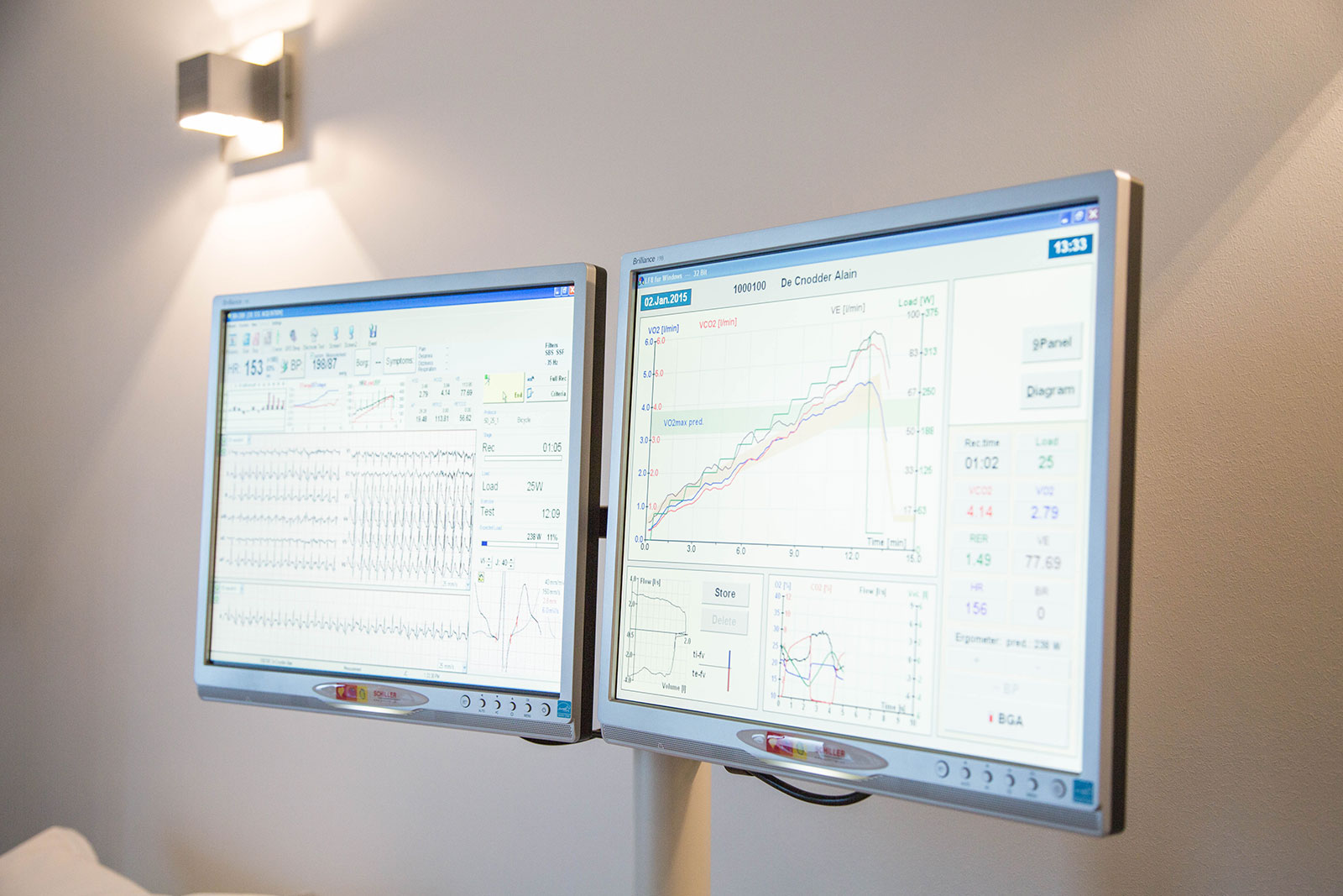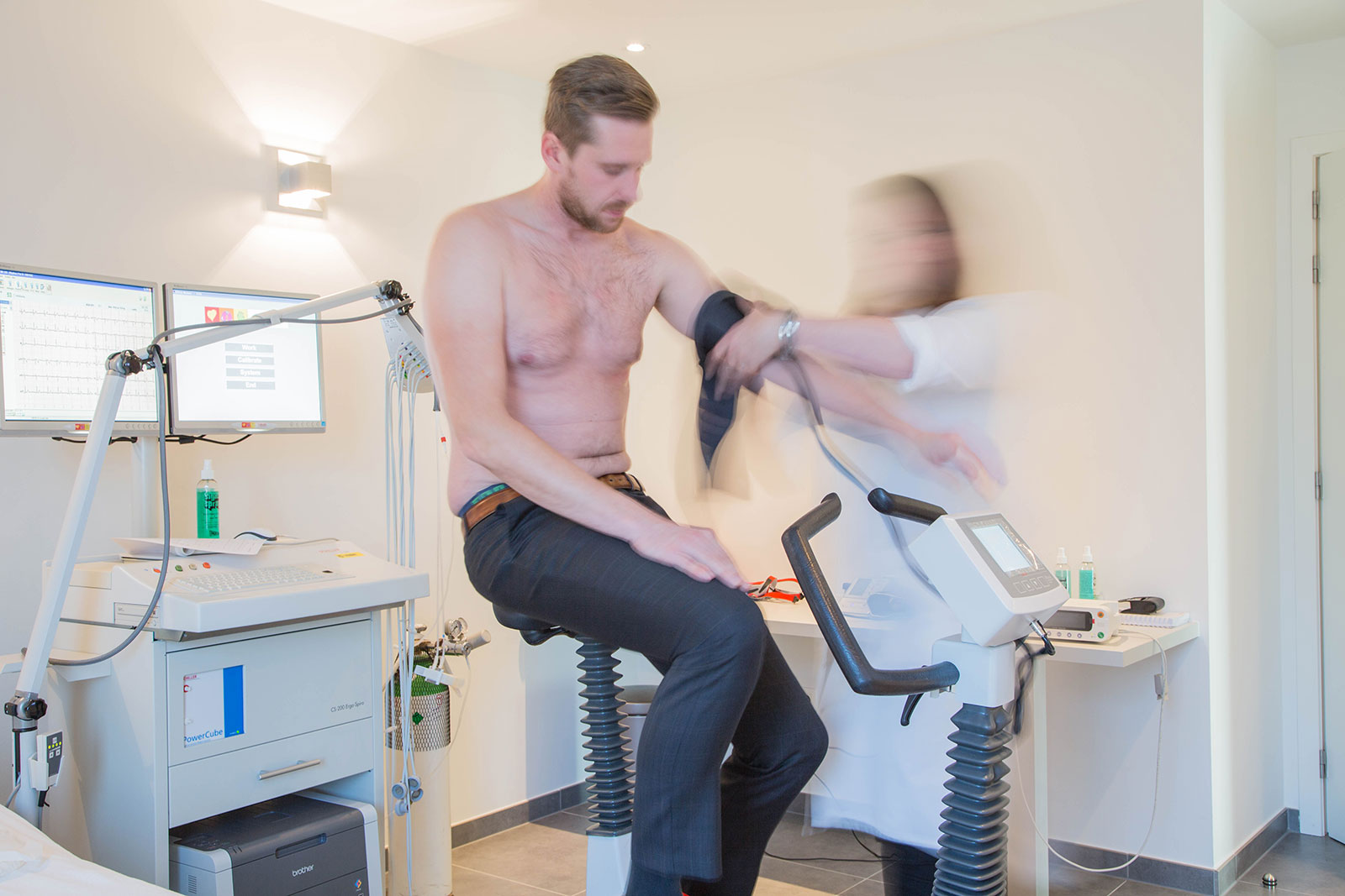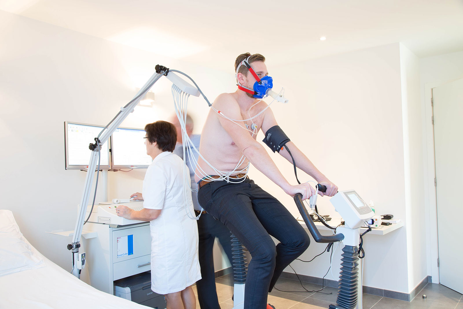 Bij middel van "3D Stress Electrocardografie-echocardiografie-spiro-ergometrie couch" wordt de patient(e) onderworpen aan een inspanningstest op een ligfiets, die de mogelijkheid verschaft om in linker laterale zijligging verder te fietsen en alzo de nodige electrocardiografische, hemodynamische en echocardiografische parameters in die houding op te schrijven. Tegelijkertijd worden tijdens deze stress test electrocardiografische, echocardiografische, spiro-ergometrische en klinische parameters en veranderingen geregistreerd. Klinisch bevindingen: Regelmatige bloeddrukcontroles, controle van de hartfrekwentie, noteren van eventuele klachten zoals dyspnoe, hartkloppingen, duizeligheid, thoracaal drukkingsgevoelen, retrosternale pijn e.a. Electrocardiografische parameters: Eventueel optreden van ischemische repolarisatieveranderingern, aritmieën en/ of atrioventriculaire geleidingsstoornissen. Echocardiografische parameters: Bij middel van 3D cardiaal echo-doppler onderzoek met strain imaging, speckle- tracking echocardiografie en advanced cardiac 3D quantification objectiveren en kwantitatieve beoordeling, in rust voor de inspanning, rond de anaërobe drempelwaarde, bij piek belasting en in rust na de inspanning, van de globale en regionale myocardcontractiliteit, van de systolische en diastolische linker ventrikelfunctie, van de myocard viabiliteit, van de reservoirfunctie van het linker atrium, van de evolutie en eventueel oplopen van de arteria pulmonalisdruk, van het hemodynamisch belang van hartklepinsufficienties en hartklepstenosen. Spiro-ergometrische parameters: Bepalen van de ventilatoire anaërobe drempelwaarde en omslagpols; bepalen van de maximale zuurstofconsumptie en de maximale zuurstofconsumptoe per kg en per minuut. Evaluatie van de aërobe mogelijkheden en de maximale inspanningscapaciteit van patienten. Evaluatie van het maximaal ademminuutvolume.