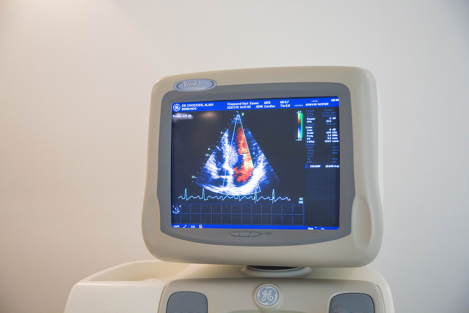 Bij echocardiografie wordt gebruik gemaakt van ultrasone golven, die uitgezonden worden door een echo apparaat, weerkaatsen ter hoogte van de verschillende hartstructuren en daarna terug opgevangen worden door hetzelfde echo apparaat. Op die manier worden de verschillende hartkamers, de 4 hartkleppen en de hartspier in beeld gebracht en kan hun morfologie bestudeerd worden. De diameters en de volumina van de verschillende hartkamers kunnen nauwkeurig gemeten worden , zowel in systole als in diastole, waardoor de pompfunctie van het hart zeer betrouwbaar kan bepaald worden. Bij een cardiaal echo-doppler onderzoek bestuderen we de snelheid en de richting van de bloedstroom in het hart om op die manier de hartklepfuncties te kunnen beoordelen en de ernst van hartklepinsufficienties en van hartklepstenosen te kunnen evalueren. Congenitale hartgebreken kunnen mooi aangetoond worden. Bij speckle-tracking echocardiografie bepalen we de gemiddelde peak systolic srain over het ganse linker ventrikel, waardoor we een juist idee krijgen over de globale contractiliteit van het linker ventrikel. Tevens kunnen we specifieke regionale zones van hypokinesie, van dyskinesie of van akinesie detecteren zodat we objectieve metingen krijgen over de regionale contractiliteit van het linker ventrikel, onderverdeeld in 16 segmenten. De gemiddelde peak systolic strain van het linker atrium wordt bepaald, waardoor de elasticiteit en de uitzetbaarheid van het linker atrium kan geëvalueerd worden. Bij advanced cardiac 3D quantification bepalen we Tmsv16-SD waarde ( standard deviation of time to maximal systolic velocity for 16 segments of left ventricle) die een uitdrukking is van de systolische dyssynchronie index en ons inlichtingen verstrekt over de al of niet homogene mechanische contractiliteit van de verschillende 16 segmenten van het linker ventrikel.